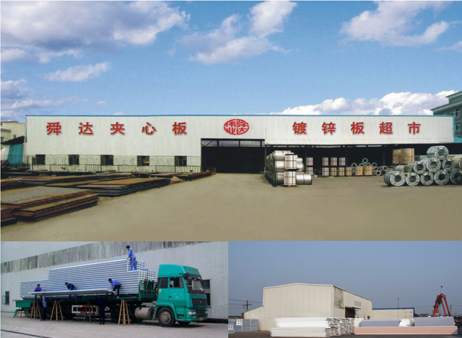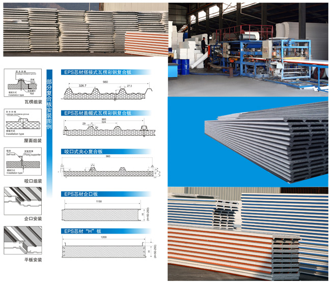 彩鋼夾心復(fù)合板是以上下兩層彩色鋼板為表層,團孔阻燃自熄型聚苯乙烯料板為芯層,通過自動化連接成型,將彩色鋼板壓型后用高強度粘合劑粘而成的一種高效組合材料。該材料具有外形美觀、色澤鮮艷、重量輕、機械強度高、隔熱、隔音等特點。廣泛用于大跨度廠房、展廳、冷庫、商場、綜合體育館、樓房加層等。